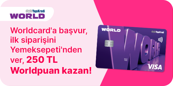 | Worldcard'lı ol, 250 TL kazan! | 30 Kasım tarihine kadar Yapı Kredi Worldcard başvurunu tamamla, kartınla ilk alışverişini Yemeksepeti'nden yap 250 TL Worldpuan kazan!