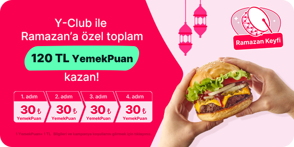 | Ramazan'a özel yeni fırsatları kaçırma! | Ay sonuna kadar geçerli Ramazan'a özel toplam 120 TL YemekPuan kazanmak için hemen Ramazan Keyfi görevine katıl! Dilediğin restorandan vereceğin 4 yemek siparişinle sende kazan! Yeni Ramazan sürprizleri için Y-Club'ı takipte kalmayı unutma! | | HEMEN KATIL! | |